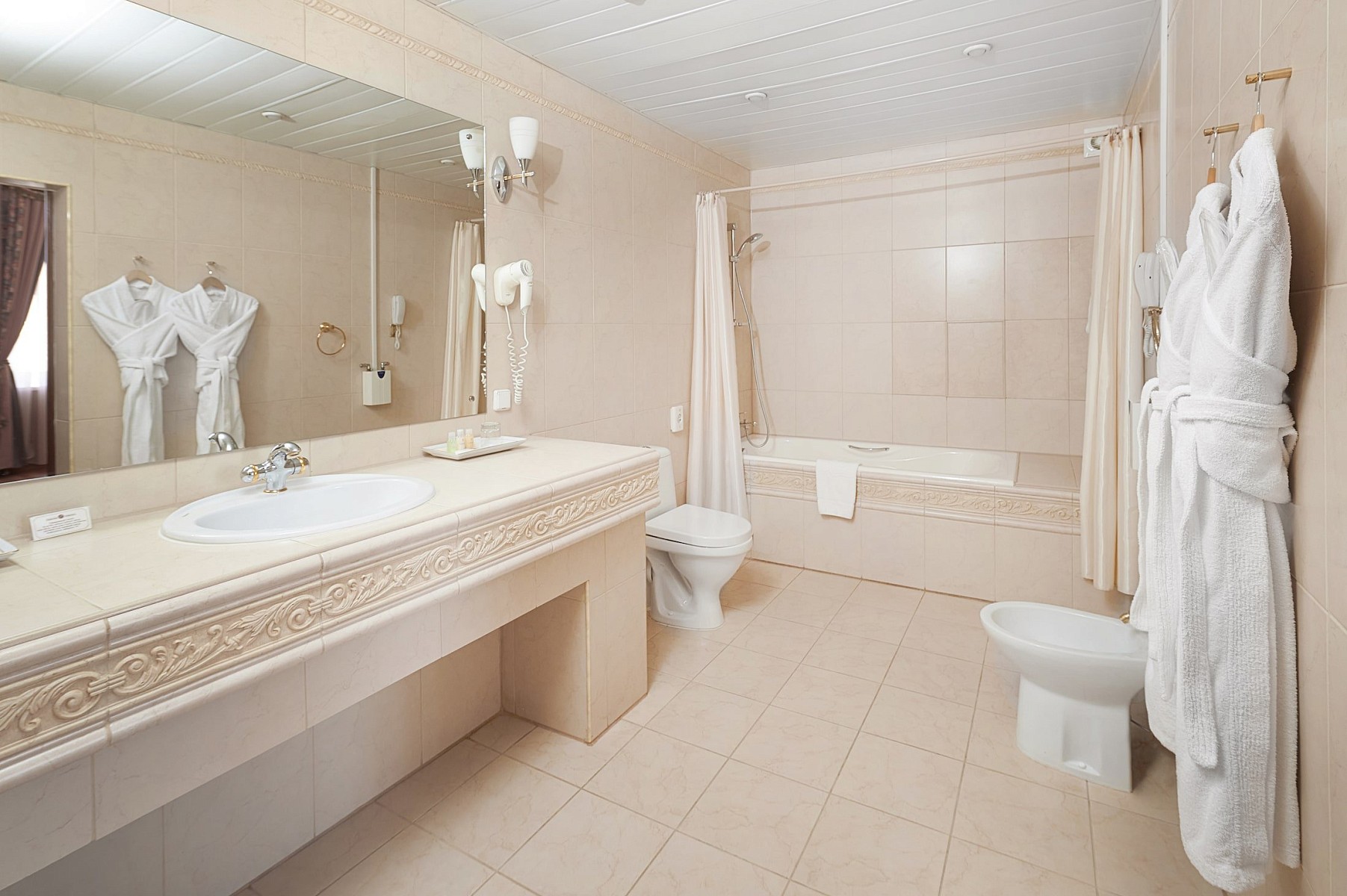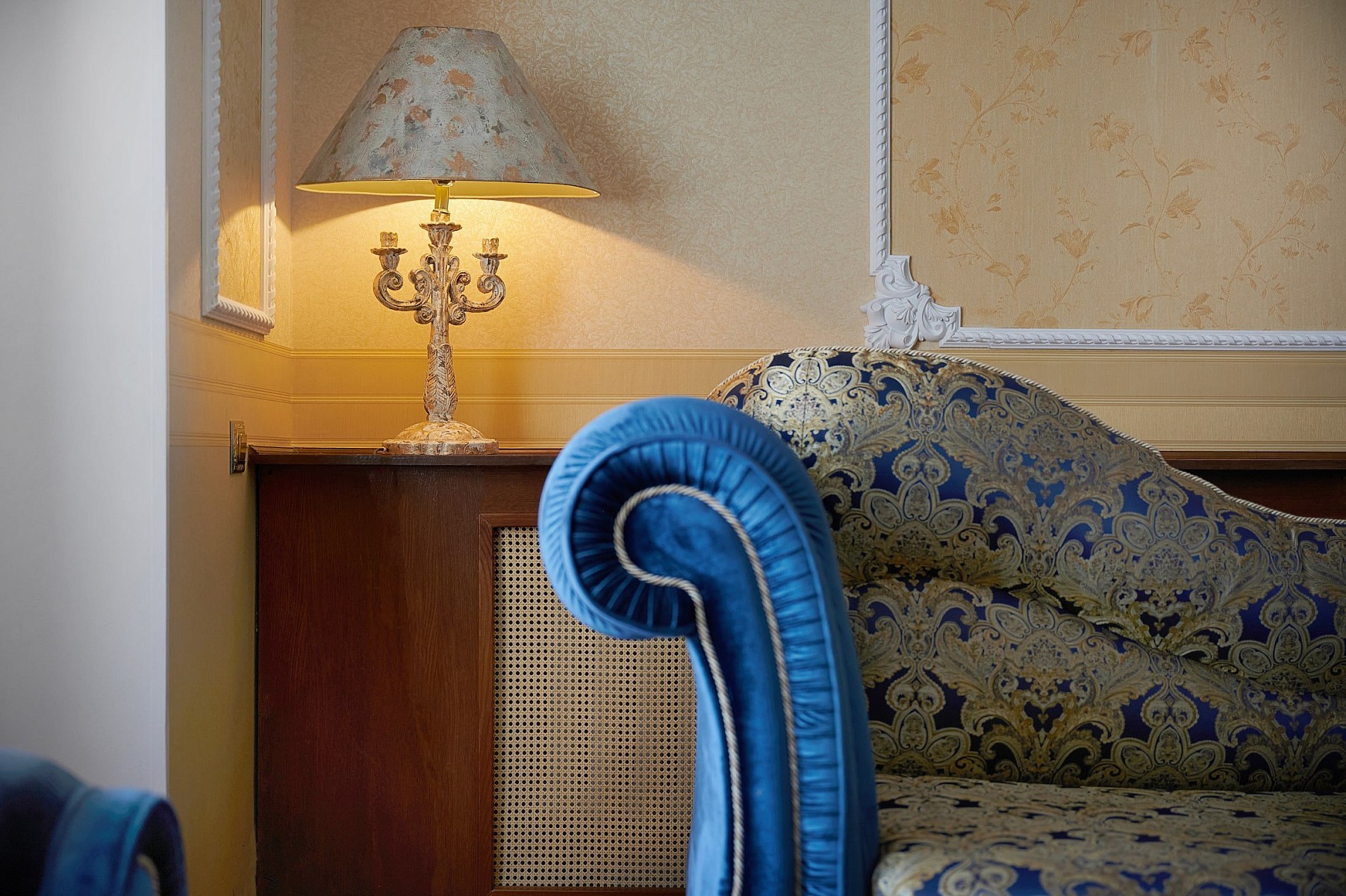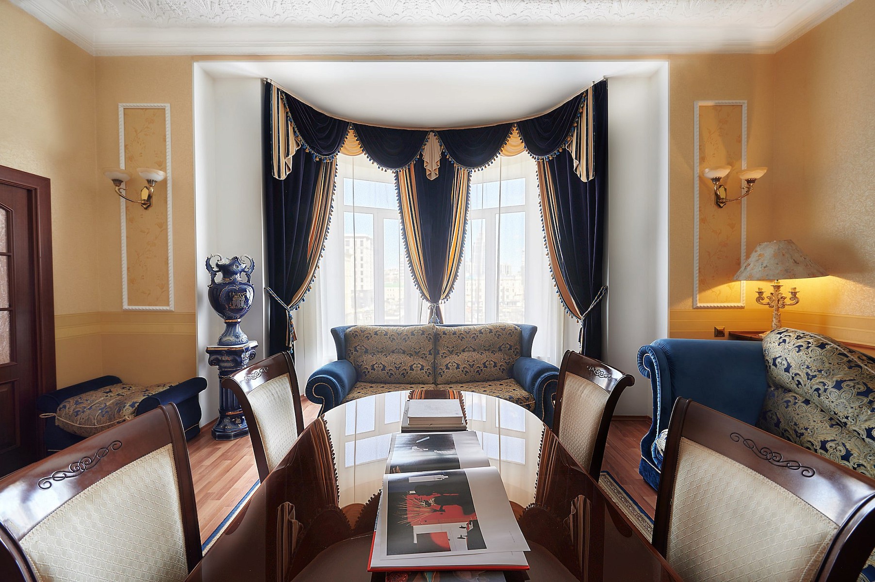 Люкс Премиум площадью 63 м2 - элегантный номер в стиле сталинского ампира, состоящий из двух комнат: спальни и гостиной с панорамными окнами.