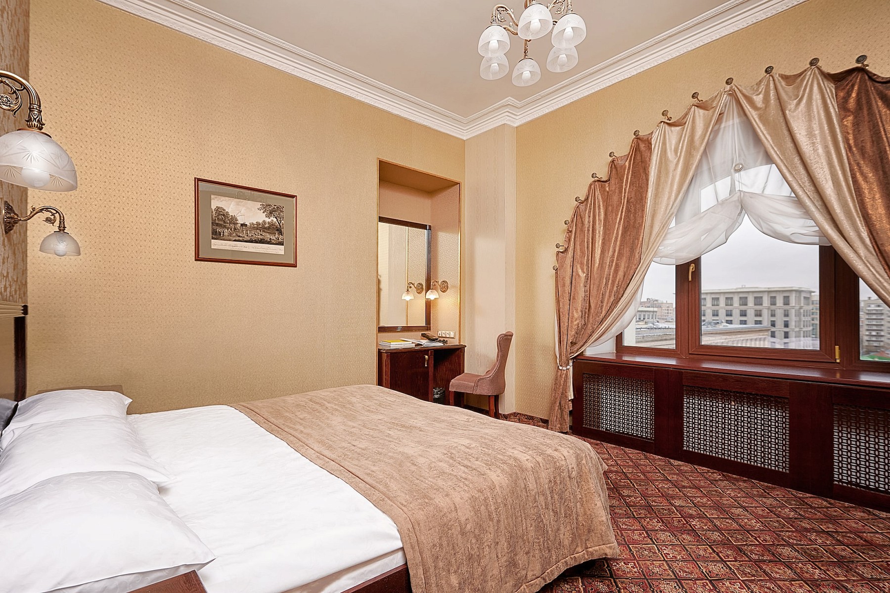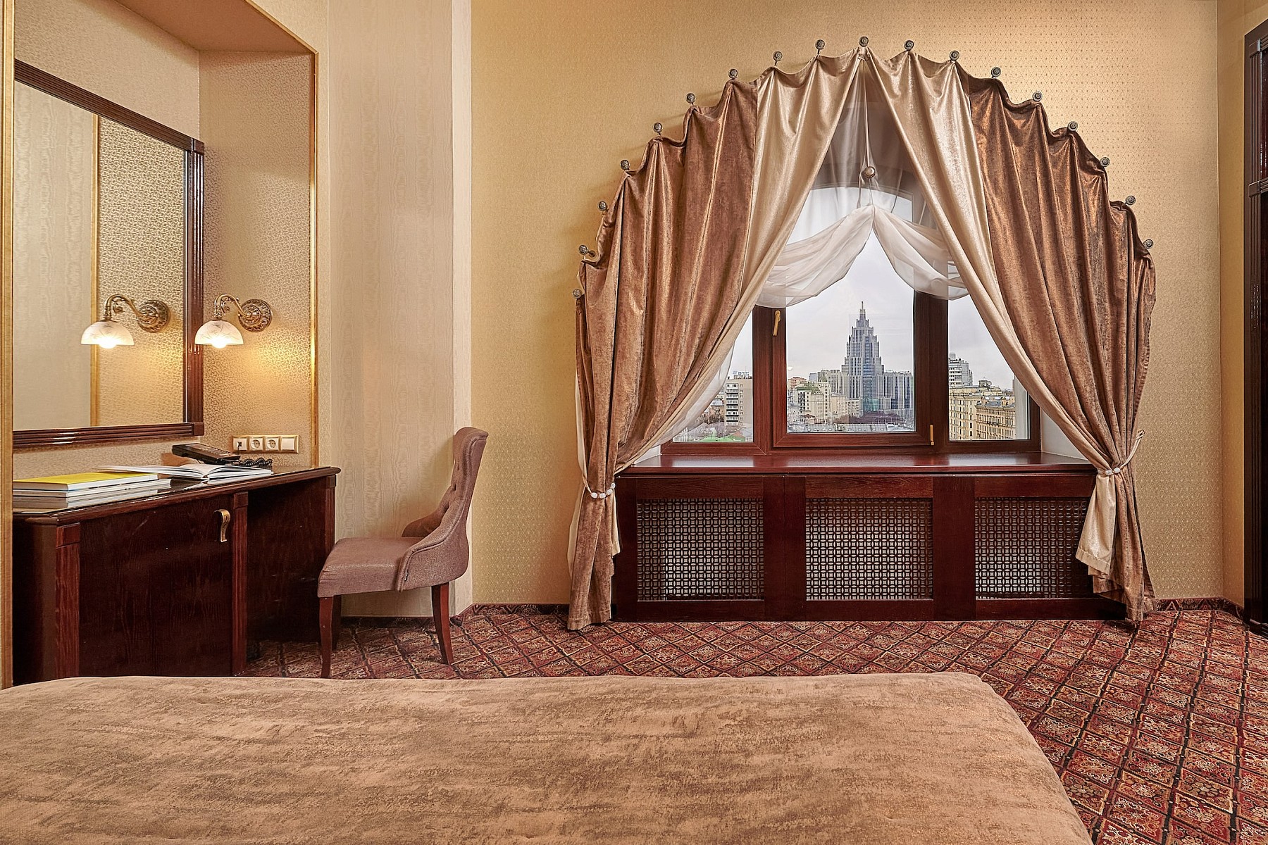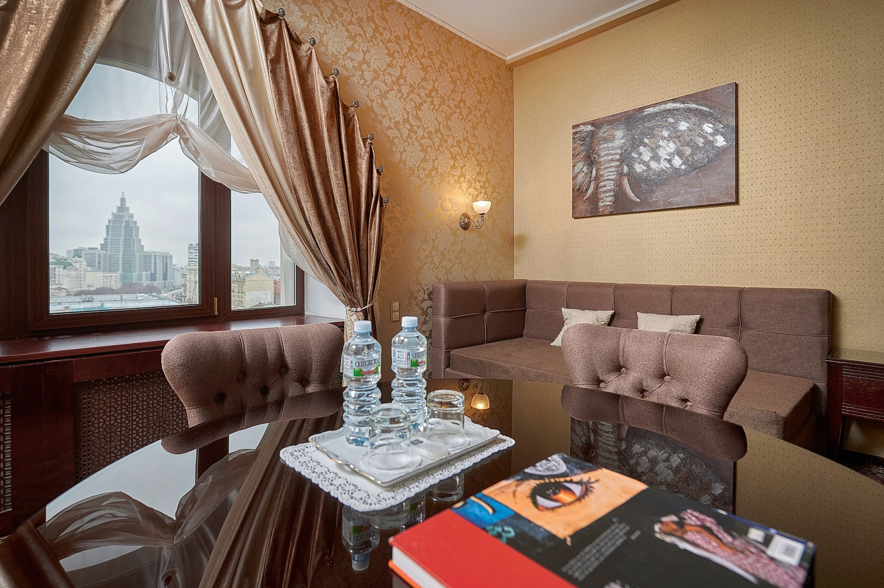 Апартаменты Маяковский площадью 62 м2 - двухкомнатный номер с панорамным видом на исторический центр Москвы состоит из просторной спальни с кроватью king size bed, гостиной c обеденной зоной и оборудованной мини-кухней со встроенным холодильником, микроволновой печью и посудой.