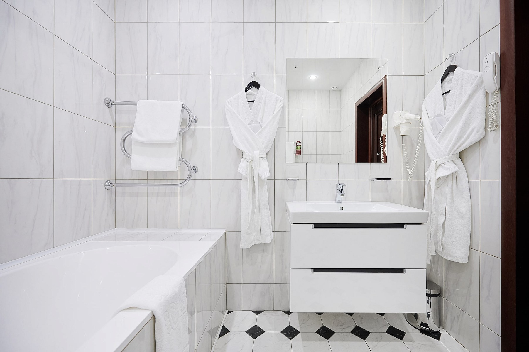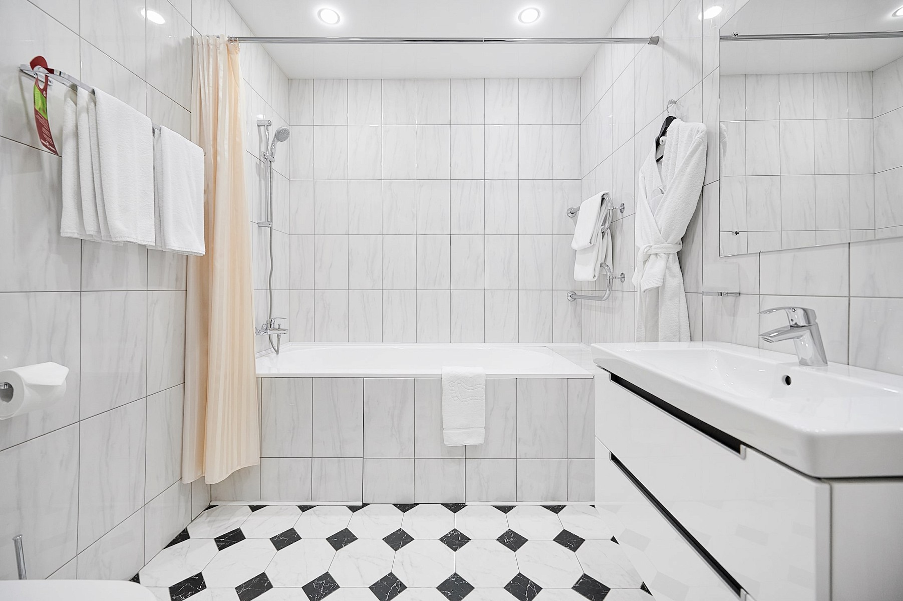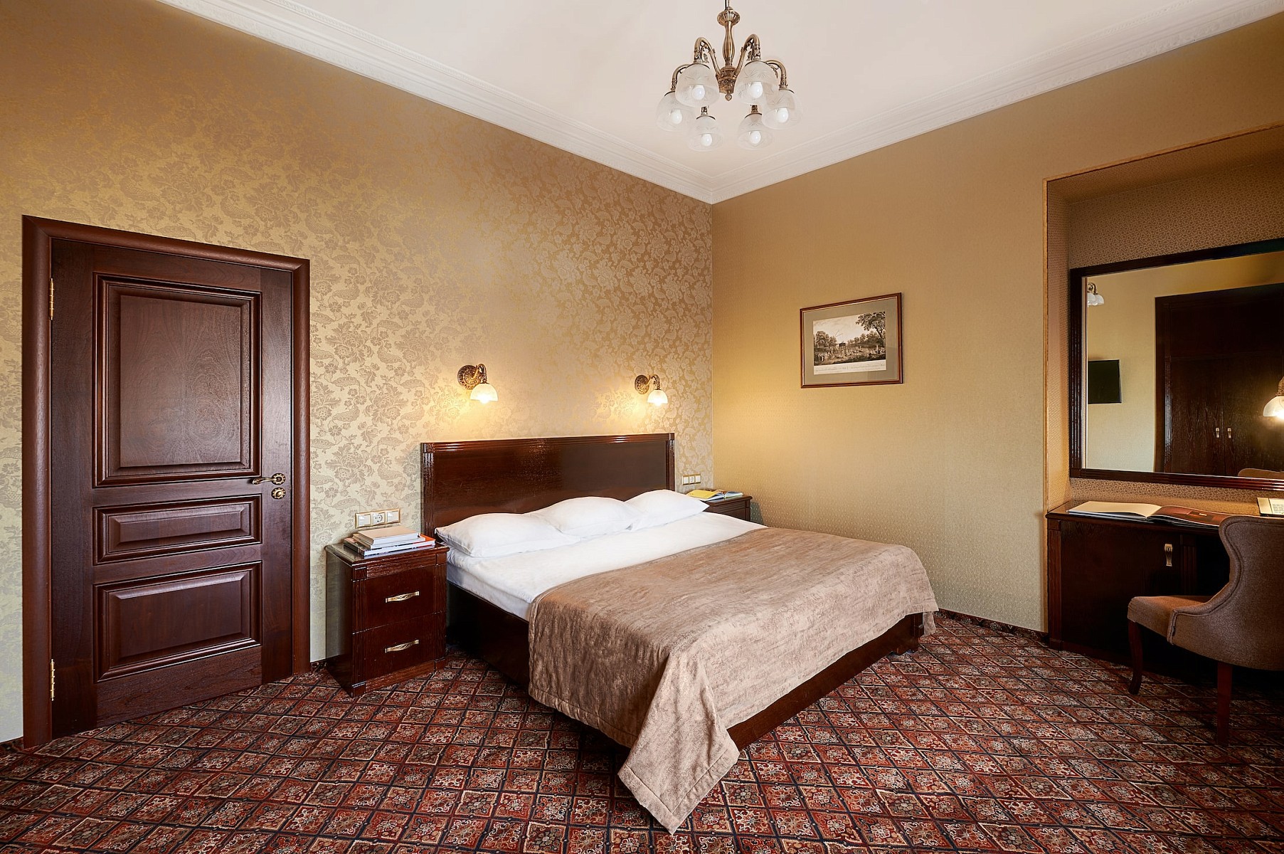 Апартаменты Маяковский площадью 62 м2 - двухкомнатный номер с панорамным видом на исторический центр Москвы состоит из просторной спальни с кроватью king size bed, гостиной c обеденной зоной и оборудованной мини-кухней со встроенным холодильником, микроволновой печью и посудой.